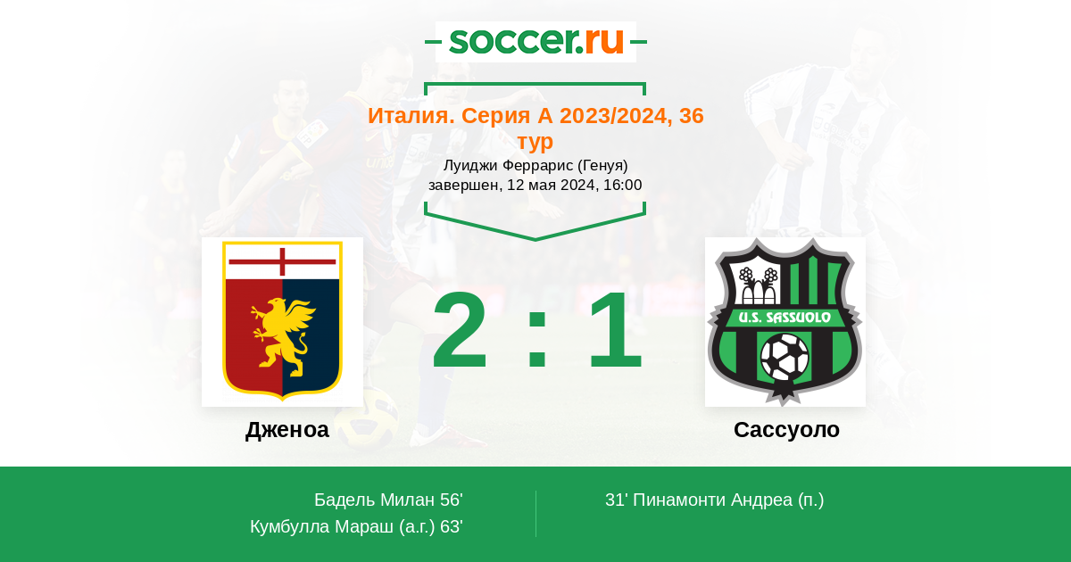 Победа над уже немотивированным “Интером”, которая была достигнута лишь за счет везения (0.29 на 1.11 xG) не вдохновляет нас на выбор андердога в данном противостоянии. “Дженоа” является гораздо более организованной командой, неплохо играющей на своем поле. За весь сезон генуэзцы потерпели всего 5 поражений на стадионе “Луиджи Феррарис”, проведя здесь уже 17 игр (29%). “Сассуоло”, в свою очередь, в гостях совершенно неубедителен - 8 поражений в 9 последних встречах.