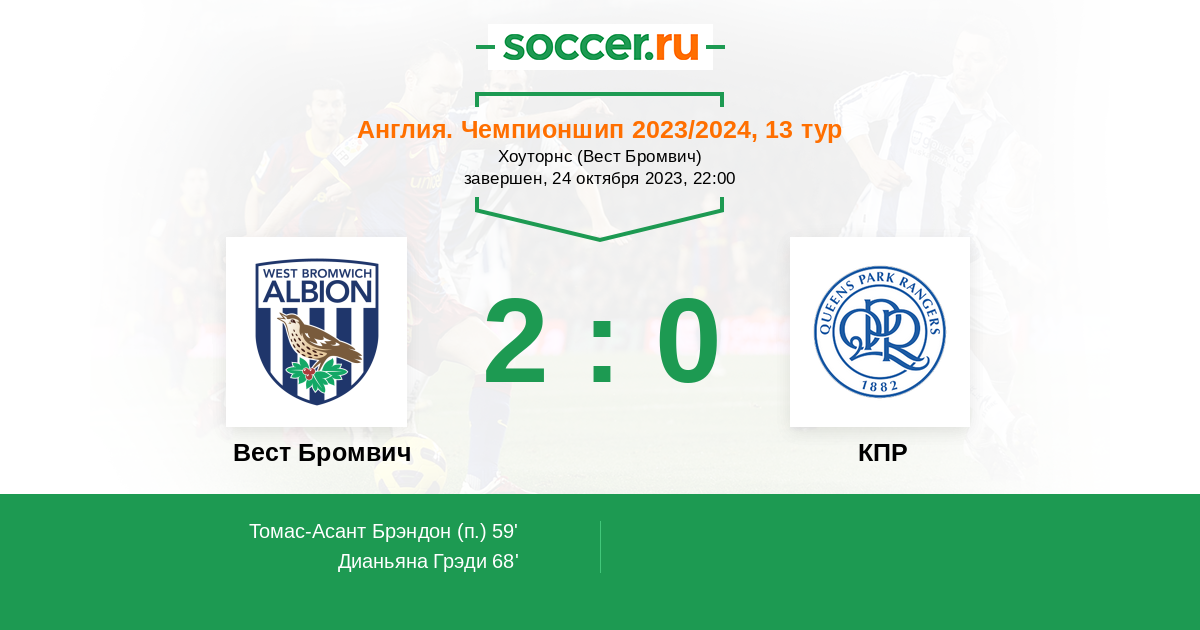 В очередном матче английского Чемпионшипа между командами Вест Бромвич и КПР смею предположить победу хозяев, потому как они располагаются выше в турнирной таблице, плюс гораздо результативнее атакуют и надёжнее обороняются.