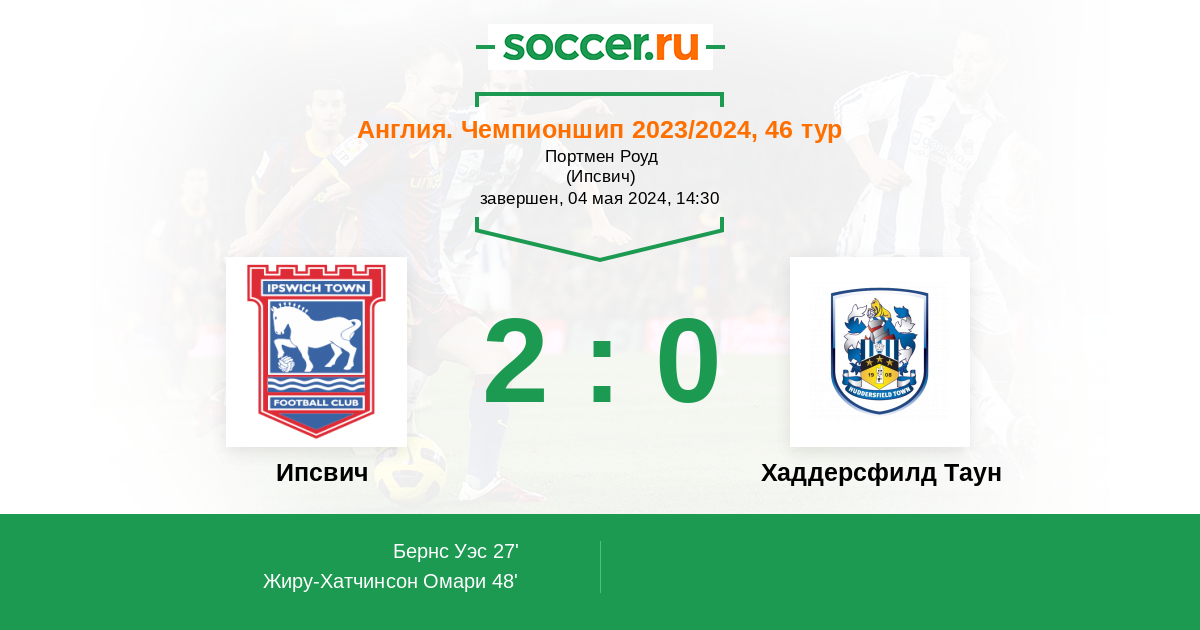 Ипсвичу достаточно не проиграть, чтобы занять 2-ю строчку в таблице и получить прямую путевку в АПЛ. Хаддерсфилд уже практически опустился в 3-й по силе дивизион и вряд ли найдет в себе какую-то мотивацию для борьбы в предстоящем поединке. Хозяева уничтожат аутсайдера и громко отпразднуют возвращение в элиту английского футбола.