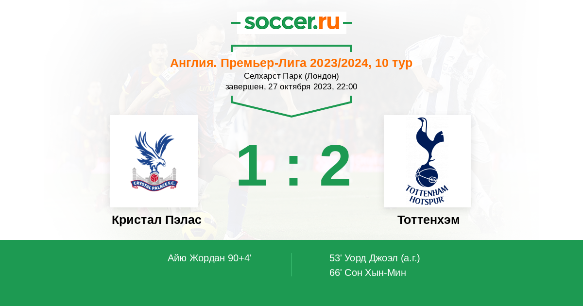 Кристал Пэлас и Тоттенхэм Хотспурс, само собой, дважды перекрещивали друг с дружкой копья под вывеской предшествующей Английской Премьер Лиги. И тогда в обоих случаях "шпорам" удалось разбить Хрустальный Дворец, причем на выезде ТХ и вовсе сумел разгромить КП со счетом 4:0. В связи с чем попробую предположить, что и в данном дерби Тоттенхэм вновь сможет положить в собственную копилку дежурные 3 балла, причем уже в 4-й раз подряд во встречах с Кристал Пэласом!)