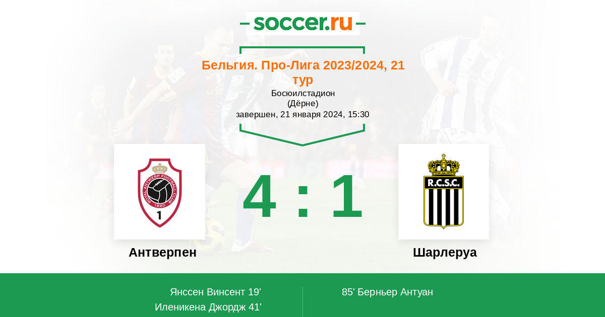 Антверпен в этом сезоне дома играет очень уверенно, ни одного поражения дома в десяти матчах, много забито, мало пропущено. Шарлеруа же на выезде - худшая команда лиги: только три ничьи в десяти матчах. Лёгкая победа Антверпена.