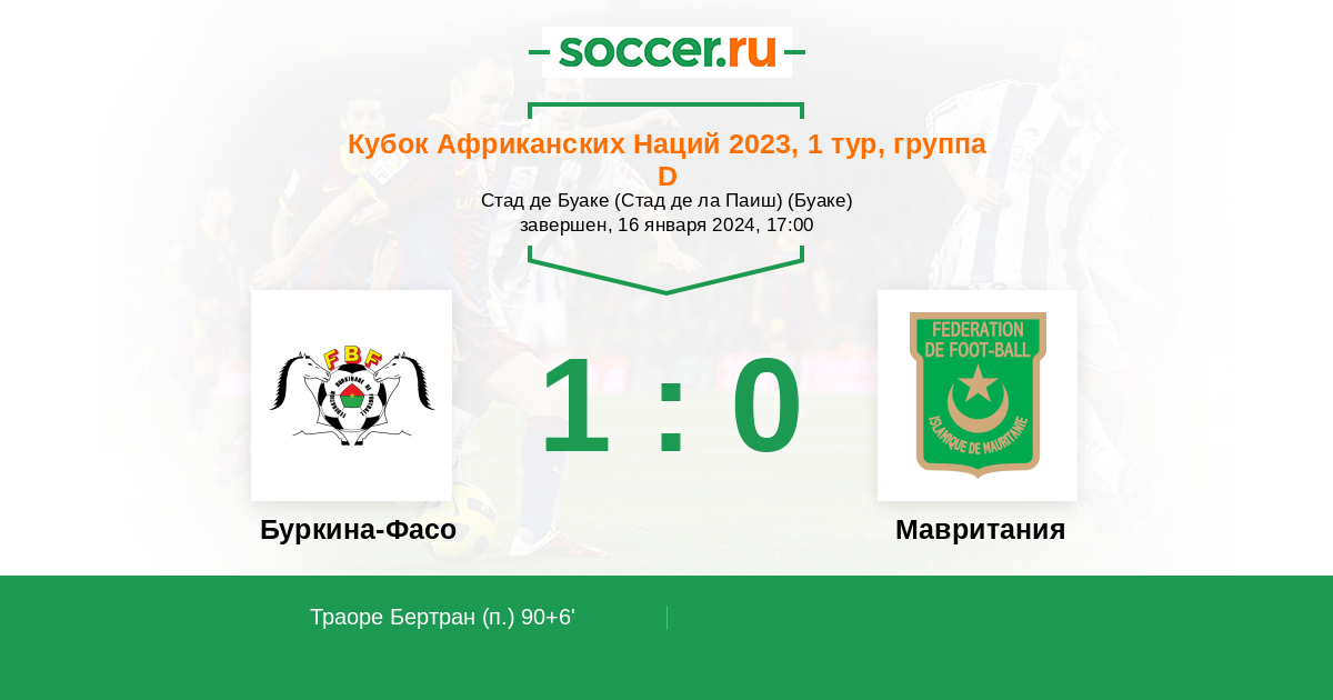 В предстоящем матче 1 - го тура Кубка Африканских Наций 2023 между командами сборной Буркина-Фасо и сборной Исламской Республики Мавритании, фаворитом на победу является команда сборной Буркина-Фасо, так как они играют лучше. Буду рад положительному результату сборной Исламской Республики Мавритании.