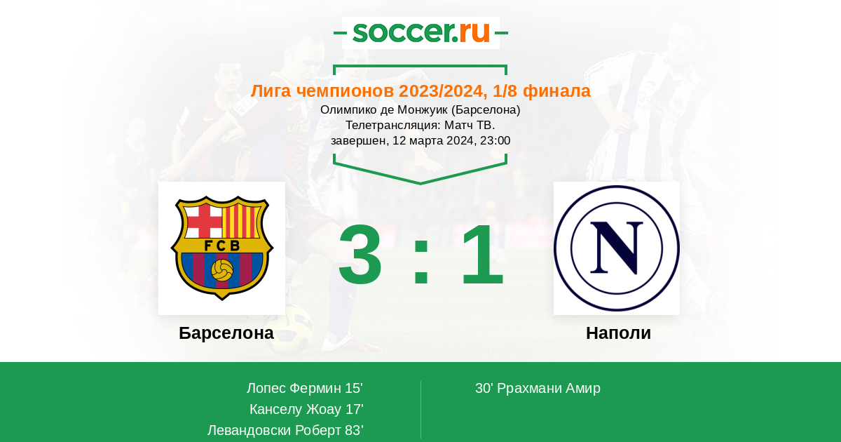 Все мы знаем желания Барселоны пройти дальше и возможно. Наполи тоже не самый плохой клуб, учитывая что он набрал сейчас ход. А если ещё учесть тот факт что игрокам пообещали очень крупные суммы за выход в следующий этап то они будут рубится за деньги и смогут как минимум не проиграть.