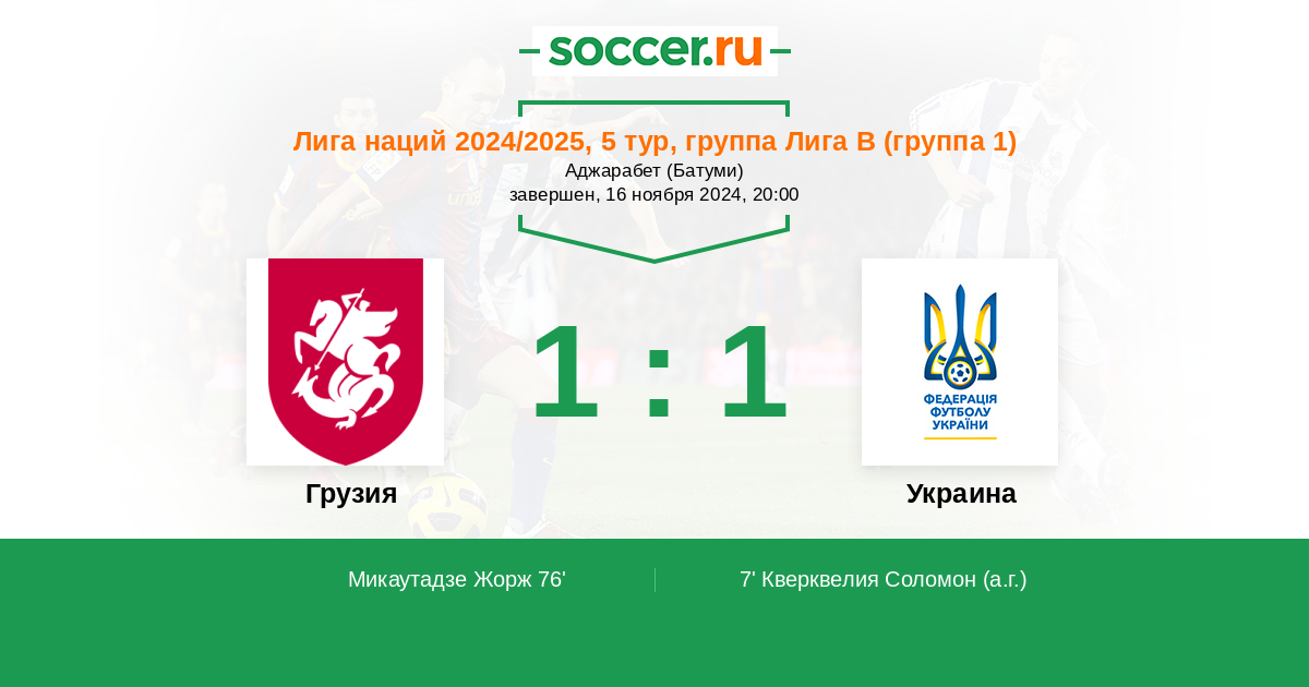 Намечается любопытное противостояние, двух сборных, примерно равных по классу. У Грузии- фактор своего поля, а других преимуществ перед соперником я не вижу. Как обычно- поддержу Мудрика и пожелаю ему УДАЧИ!!!!!!!