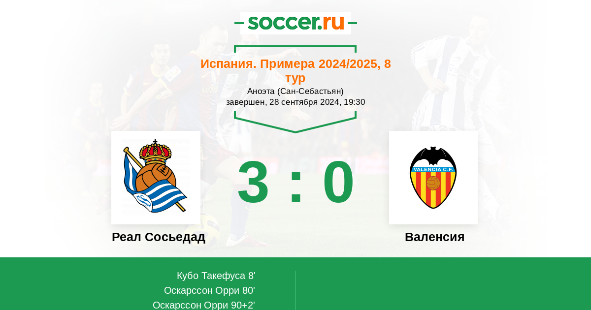 В предстоящем матче 8 - го тура Ла Лиги Испании между командами Реал Сосьедад Сан-Себастьян и Валенсия , фаворитом на победу является команда хозяев Реал Сосьедад , так как они играют дома