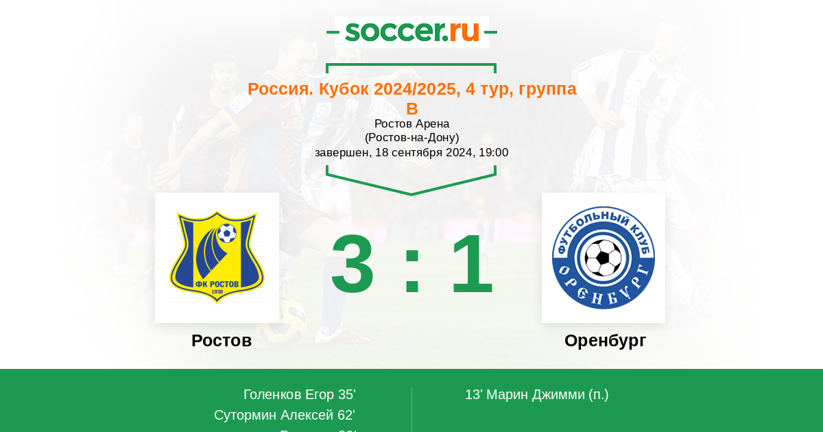 Ростов - Оренбург ! Кубок , скорее всего будет ротация , Гости судя по всему больше озадачены своим положением в чемпионате и сильного рвения не покажут . Ростовчане могут сыграть в своё удовольствие для местной публики - ставлю на них .