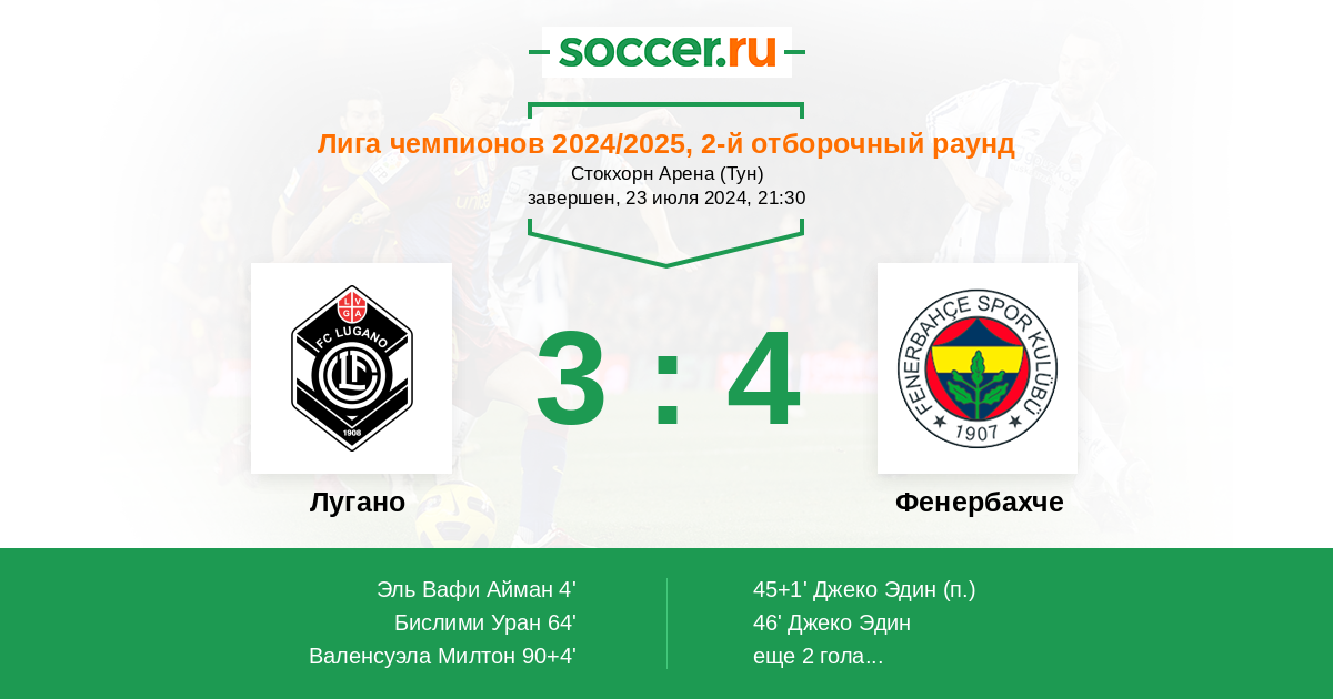 Жозе Моуриньо, великий Жозе Моуриньо! Начинает он свой новый поход в Турции. Уровень явно ниже чем топ чемпионаты, но это не значит что он не найдёт возможности пошуметь. Руководство клуба уже высказалось полной поддержкой особенного и уже на деле вплотную охотится на трансферном рынке. Нет никаких сомнений что швейцарский Лугано на порядок слабее по составу и по игре. Против турецких клубов практически невозможно играть на их территории, а значит сюда будут брошены все силы. У Лугано наверняка будут проблемы с реализация, а Жозе не глупец и сыграет понадёжнее от обороны. Первая игра как и вторая будет идти по сценарию Фенербахче, я очень сомневаюсь что Лугано сможет навязать свою игру, забить может и смогут, но не более, Фенербахче первую игру выиграет крупно и игра в Турции будет просто формальность.