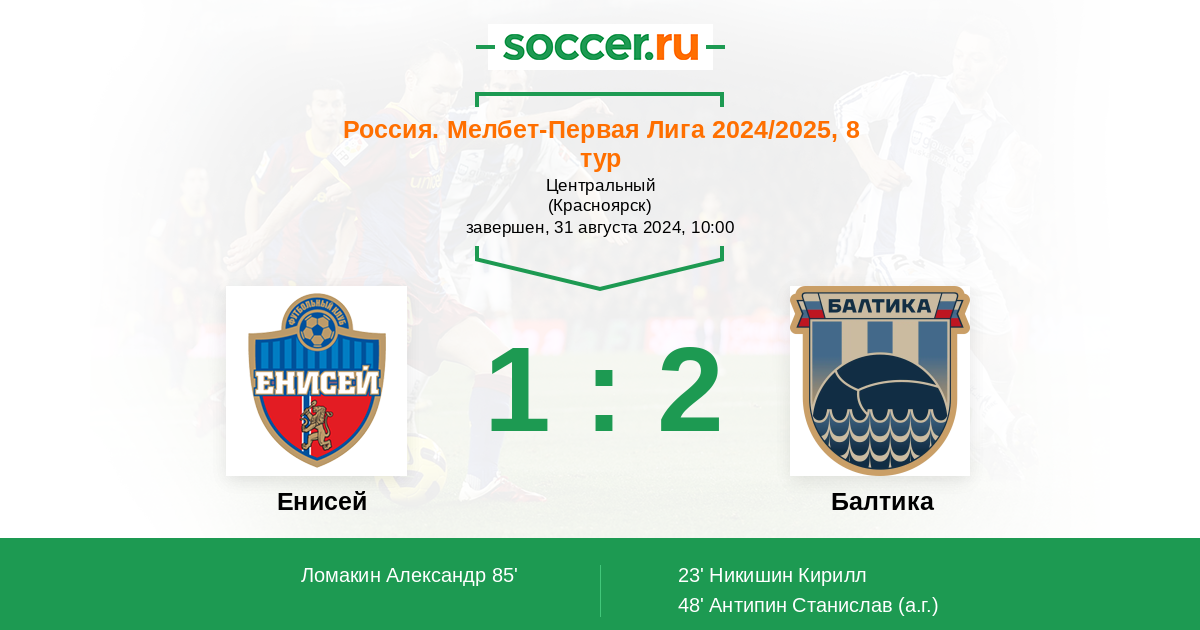 Енисей - Балтика ! Команды на данном этапе по силе примерно равны и находятся в центре тур . таблицы . Проигрыш значительно усугубит ситуацию в худшую сторону любой из команд . Возможно всё решит один гол . Осторожно , исходя из клубных симпатий - Ф2 ( 0 ) .