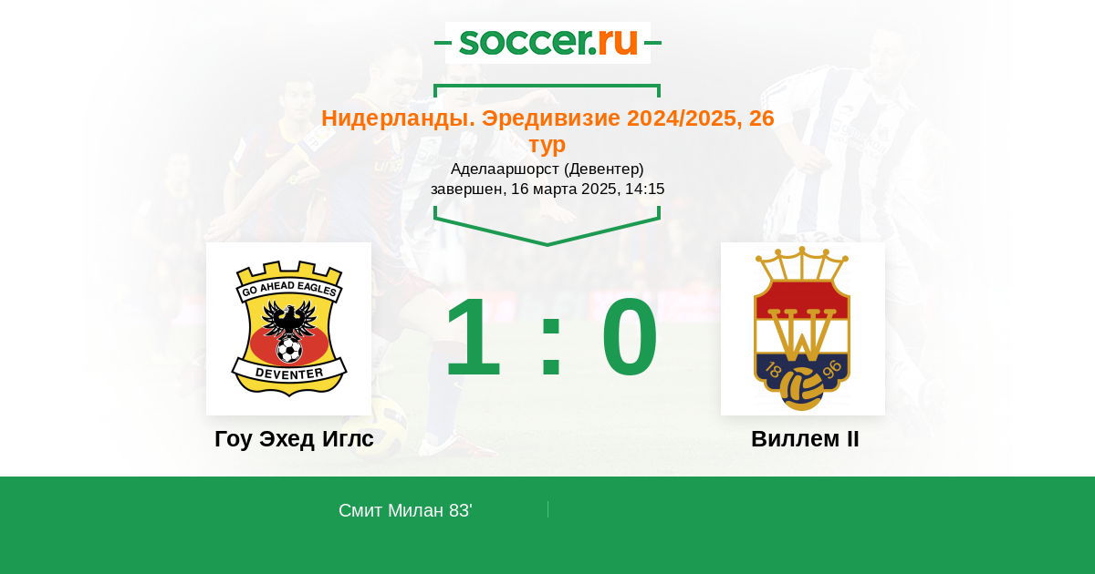 В предстоящем матче 26 - го тура нидерландского Эредивизие между командами Гоу Эхед Иглс Девентер и Виллем 2 , моим фаворитом на победу является команда хозяев Гоу Эхед Иглс .