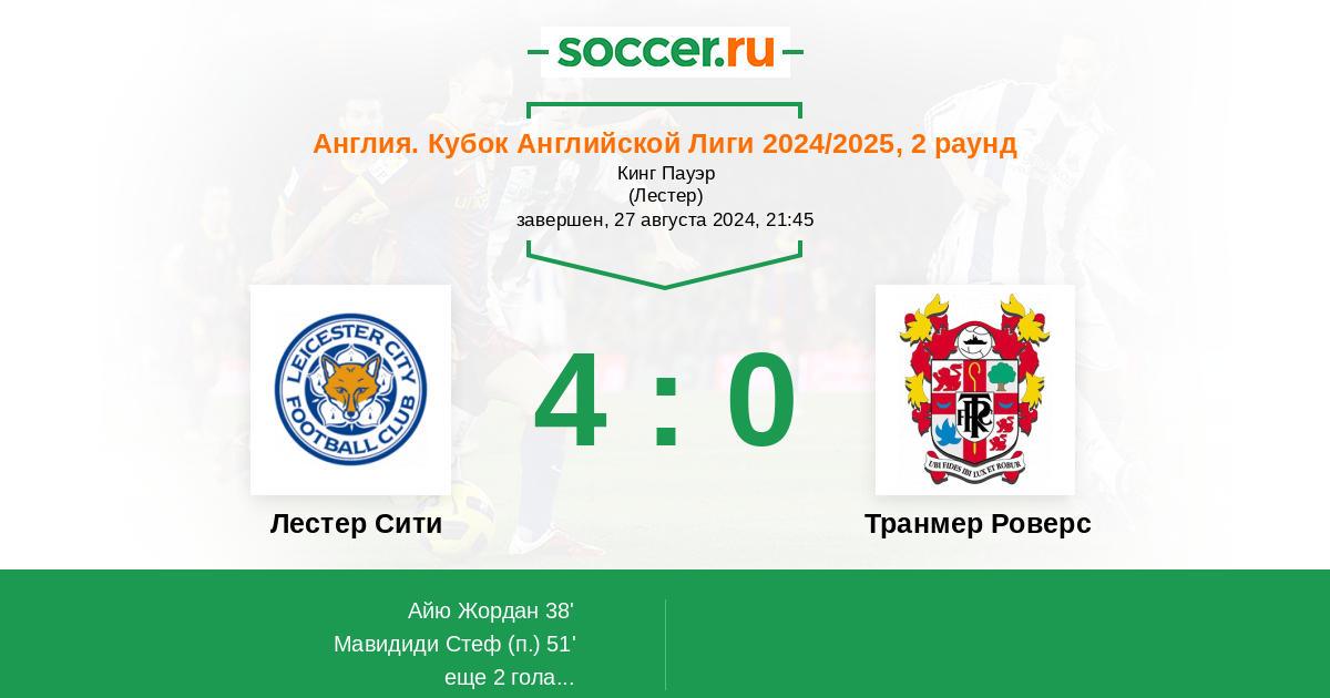 Лестер за год вернулся в Английскую Премьер-лигу и показал в первых двух турах сильную игру. Транмер Роверс представляет третью по силе лигу в Англии и неделю назад проиграл молодежному клубу Эвертона. Сможет ли Лестер воспользоваться удачной жеребьевкой???