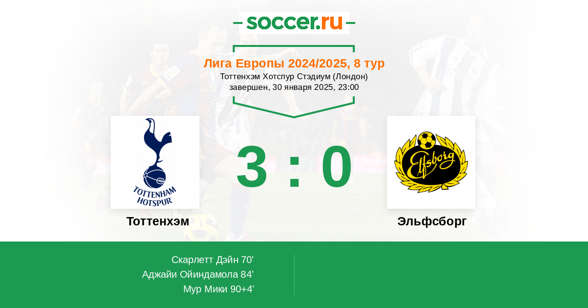 Тоттенхэм - Эльфсборг . В этом матче у каждого свои задачи . Шпорам нужно удержаться в верхней восьмёрке, а шведам попытаться попасть в раунд плей- офф . ПОБЕДА ХОЗЯЕВ ...