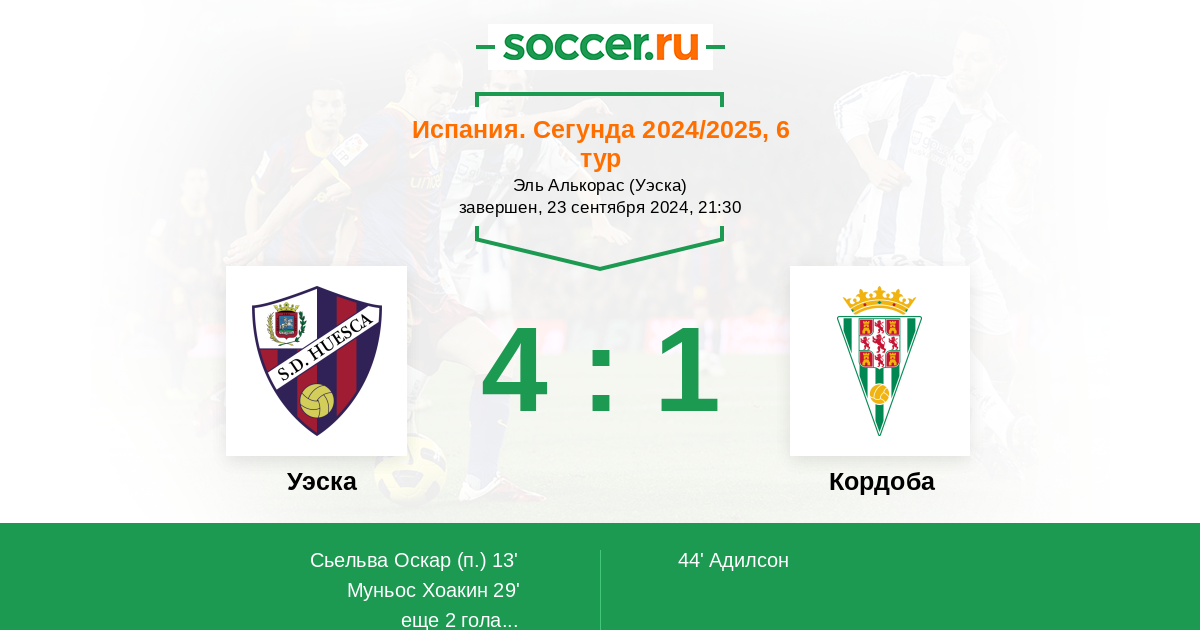 В матче испанской Сегунды между командами Уэска и Кордоба рискну предположить победу хозяев, потому как они располагаются выше в турнирной таблице, плюс результативнее играют в атаке и надёжнее в обороне.