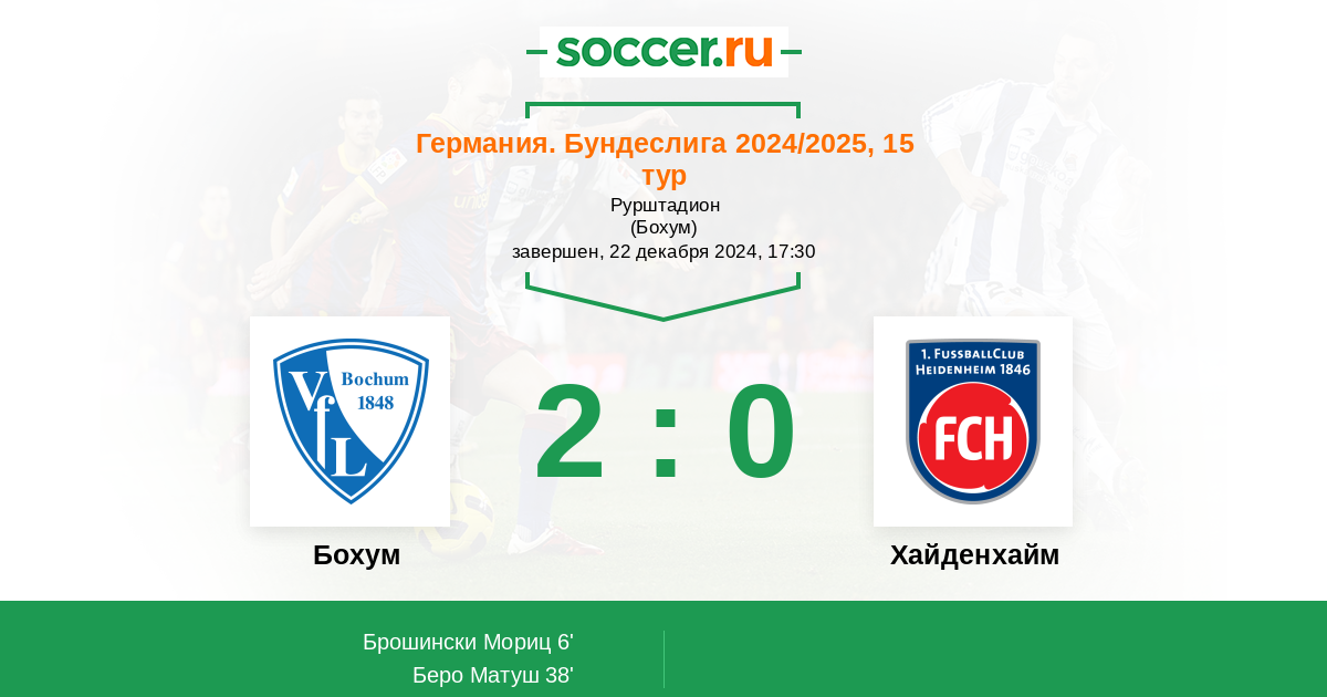 Бохум неконкурентоспособен в этом сезоне. Их обыгрывают все кому не лень, разница забитых и пропущенных мячей обескураживающие, побед за почти пол чемпионата нет... Так что даже не блещущий Хайденхайм кажется фаворитом в таком матче.