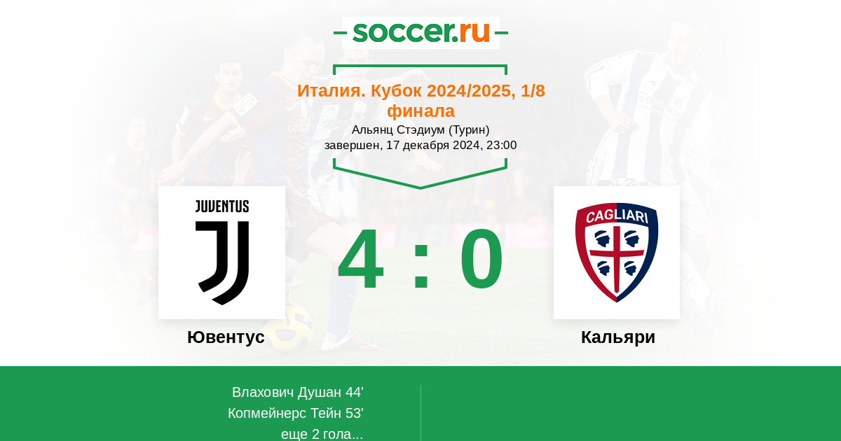 Ювентус - Кальяри ! Кубковый матч , вроде как отдельный турнир , но думаю игроки " Старой сеньоры " захотят , хоть как то реабилитироваться перед собственной публикой и сыграют в атаку .