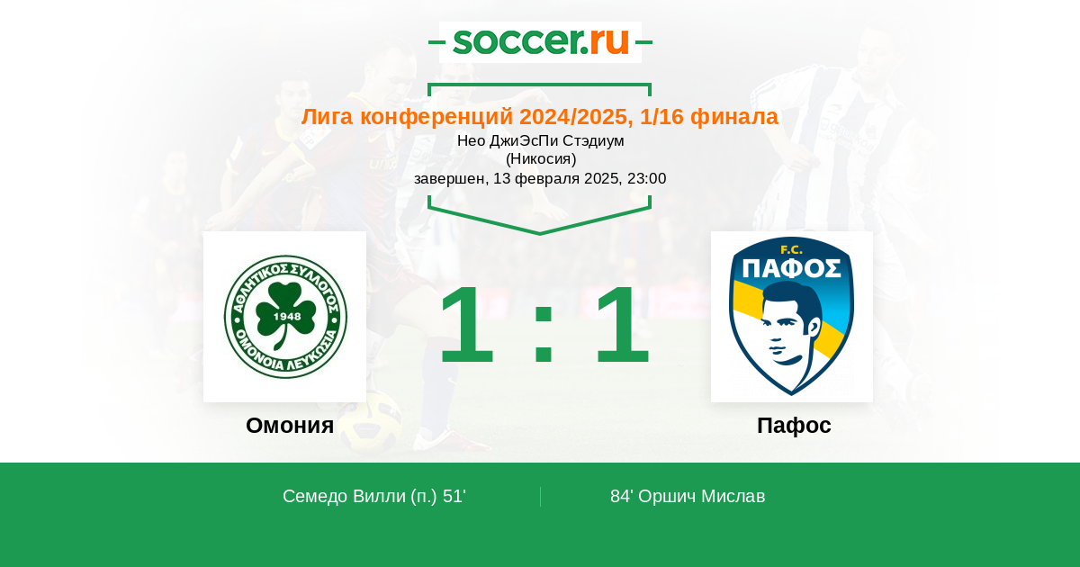 Омония - Пафос ! Нас ожидает интересное южное противостояние . Встречаются две кипрские команды , и хотя команды не отличаются чрезмерной результативностью , но они очень хорошо знают сильные и слабые стороны друг друга - рискну на больше - ТБ .