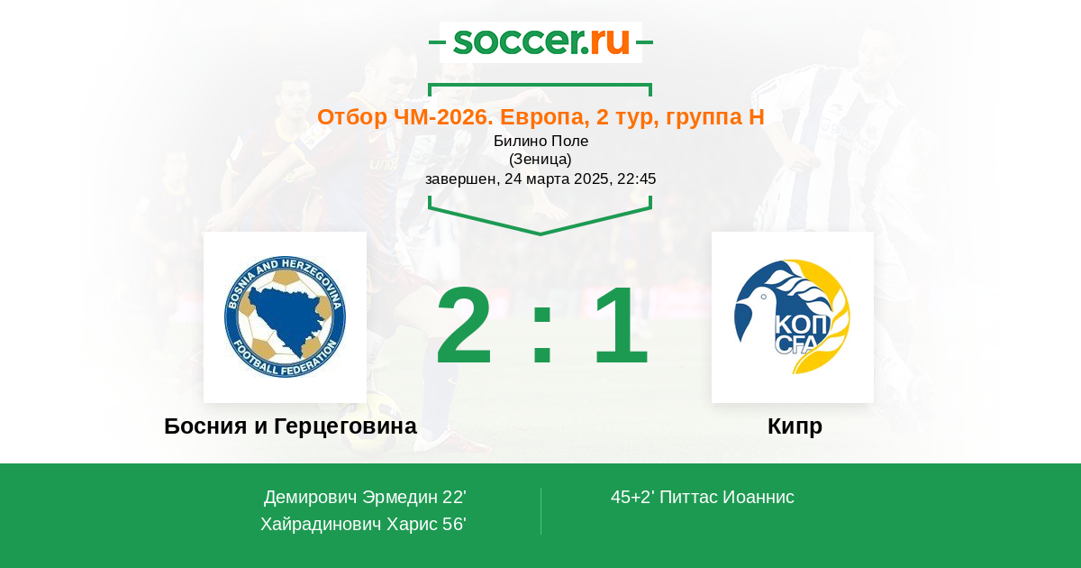 Босния после неудачно проведенного группового этапа Лиги наций, когда пришлось получать неприятный опыт в играх с Венгрией, Нидерландами и Германией, с победы стартовала в отборе на ЧМ-2026, обыграв в гостях Румынию со счетом 1:0. Создан хороший задел, который команда собирается развить в противостоянии с киприотами и наконец-то порадовать своих поклонников после долгого периода неудачных результатов в домашних встречах после игр с соперниками высокого уровня.