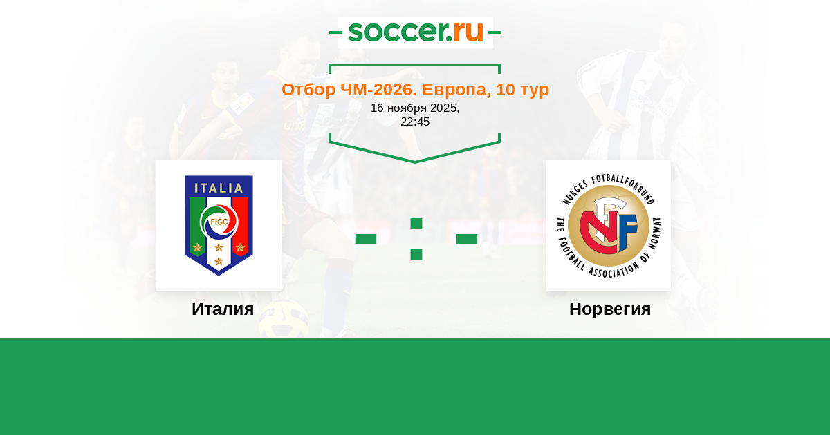 Италия сегодня имеет лишь теоретическую возможность побороться за прямую путевку на мундиаль – необходимо обыграть Норвегию с разницей в девять голов. Задача безусловно из разряда фантастики, норвежцы находятся в великолепно форме и в первом круге уже показали, что способны играть с Италией на равных. В гостях против "скуадры адзурри" будет намного сложнее, итальянцы безусловно будут стремиться победить любой ценой и завершить групповой этап победой – добыть три балла дома Италия вполне способна, тем более что у Норвегии есть право на ошибку.