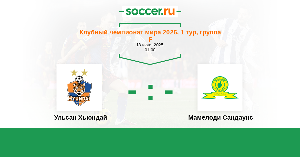 Ульсан Хьюндай - Мамелоди Сандаунс ! Накануне две другие команды - соперники по группе разошлись в своём матче нулевой ничьёй , тем самым обозначили радужную перспективу участникам этого матча в борьбе за выход из группы - короче жду голы .