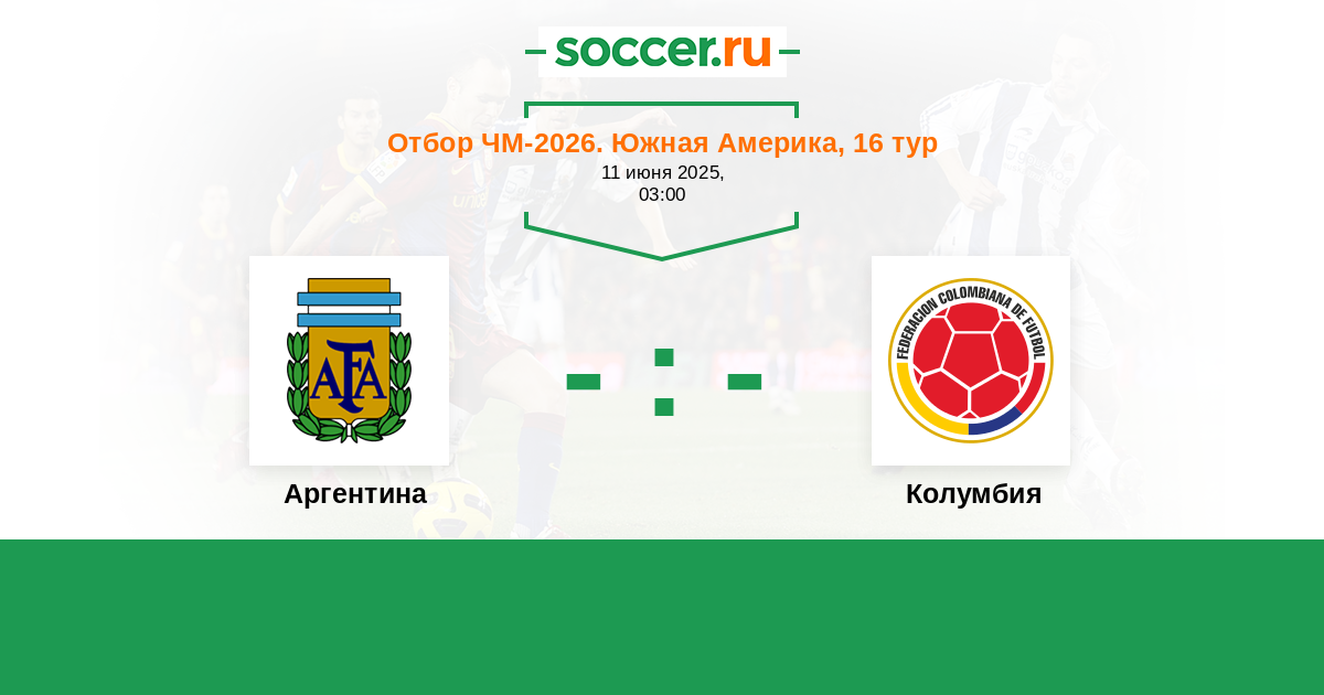 Колумбия трижды приезжала на Монументаль и все эти игры проиграла, здесь яро болеют за Аргентину и ещё до матча стало известно что гости не фавориты, это было и так ясно изначально, сама игра гостей совсем ужасная, Колумбия могла победить Парагвай и в теории иметь шансы на повышение по таблице, но камбэк от гостей не позволил это сделать, победа Колумбии была в последний раз над Чили в прошлом году, сейчас имеют четырёх матчевую без победную серию.