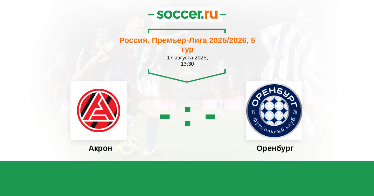 Акрон - Оренбург ! Хозяева поля ещё не потерпели ни одного поражения - соответственно находятся в приличной форме . Гости наоборот ещё не одержали ни одной победы , но в каждом матче стараются бороться . ТБ .