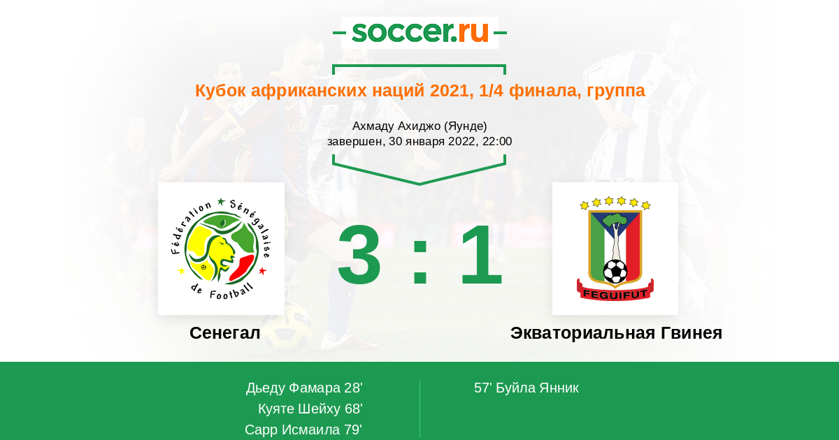 Что касается итога встречи, то тут мы ожидаем победу сборной Сенегала. С большей долей вероятности сказка Экваториальной Гвинеи завершится на стадии 1/4 финала, так как соперник в лице сенегальской сборной окажется просто-напросто неподъемным для уже сотворившей чудо “национальной Молнии”. Благодаря ряду топ-игроков в обороне (Менди в воротах, Кулибали, Диалло, Буна Сарр в защите, а также “питбуль” из ПСЖ Идриса Гуйе в опорной зоне), соорудивших непроходимый щит, Сенегал до сих пор не пропустил ни одного мяча на турнире. При этом в атаке набирают форму звездный форвард Садьо Мане и восходящая звезда “Марселя” Бамба Дьенг, забившие в недавнем поединке с Кабо-Верде по голу. Вингер “Ливерпуля”, к слову, несмотря на все опасения после тяжелого столкновения с голкипером команды-соперницы в последней игре, к предстоящему матчу должен быть готов.