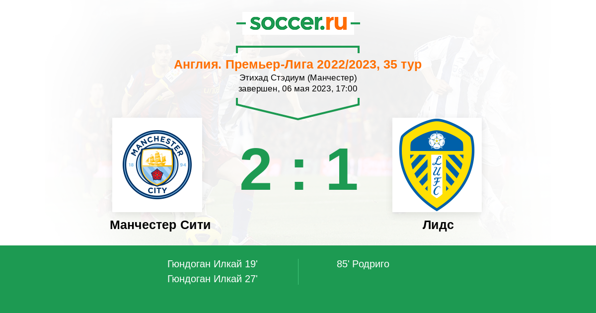 В нынешнем положении и в нынешней форме сити всё ещё имеет все шансы взять все возможные титулы в этом сезоне, Лидс отличная возможность набить очки и разницу мячей, тот лился который когда то в 21 году одолел сити в гостях в прошлом, тогда команда держалась уверенно в середине таблицы и много забивала, а сити уже обеспечил себе титул чемпиона АПЛ, разве что им все таки удастся забить и не пропустить 6-7 голов, учитывая что сити нужно беречь силы для следующего выхода против реале в лч.