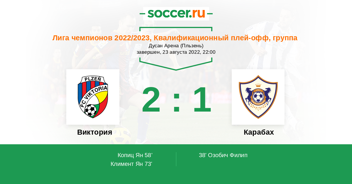 "Виктория" постоянно забивает на своём поле и наверняка сумеет отличиться в игре с "Карабахом". Гости же будут искать счастье в быстрых атаках, и скоростная передняя линия "скакунов" вполне может огорчить возрастную оборону "Пльзени". Поставим на то, что по итогам основного времени на табло "Дусан Арены" будет результативная ничья, и дело дойдёт до двух дополнительных таймов, а может и до серии пенальти.