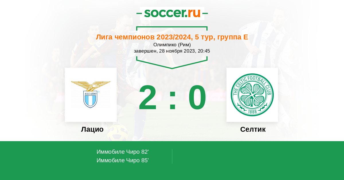 Да, в начале октября в Глазго итальянцы взяли верх над шотландцами. Селтик смотрелся ничуть не хуже оппонента, а местами даже лучше. По xG переиграл соперника 0,99 против 0,95. Был сильнее практически по всем статистическим показателям. Но итог - поражение 1-2. Думаю, и в Италии британцам тоже не светит даже ничья. Почему? Всё просто. Лацио в родных стенах хорош, а на своём стадионе чаще побеждает, чем нет как в национальном чемпионате, так и на международной арене. Ну а Селтик дома и Селтик за пределами Шотландии - это два совершенно разных по силе коллектива. Явное и свежее подтверждение этому - двухматчевое противостояние с Атлетико.