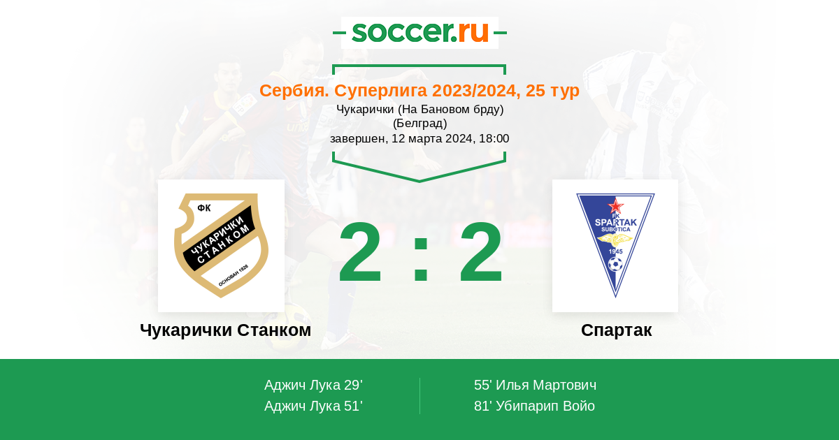 Новости матча Чукарички Станком против Спартак Суботица