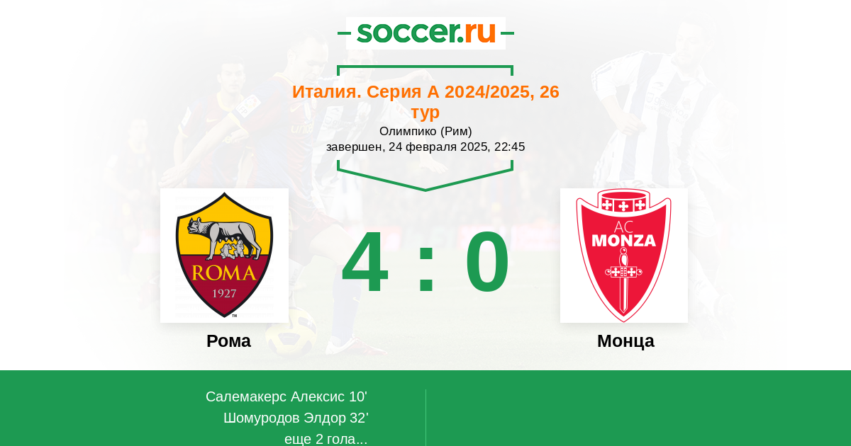 Рома - Монца ! По большому счёту Рома ещё может зацепится за ЕК (если конечно это надо ) . Ну а Монца уже судя по всему может расслабится . ТБ .