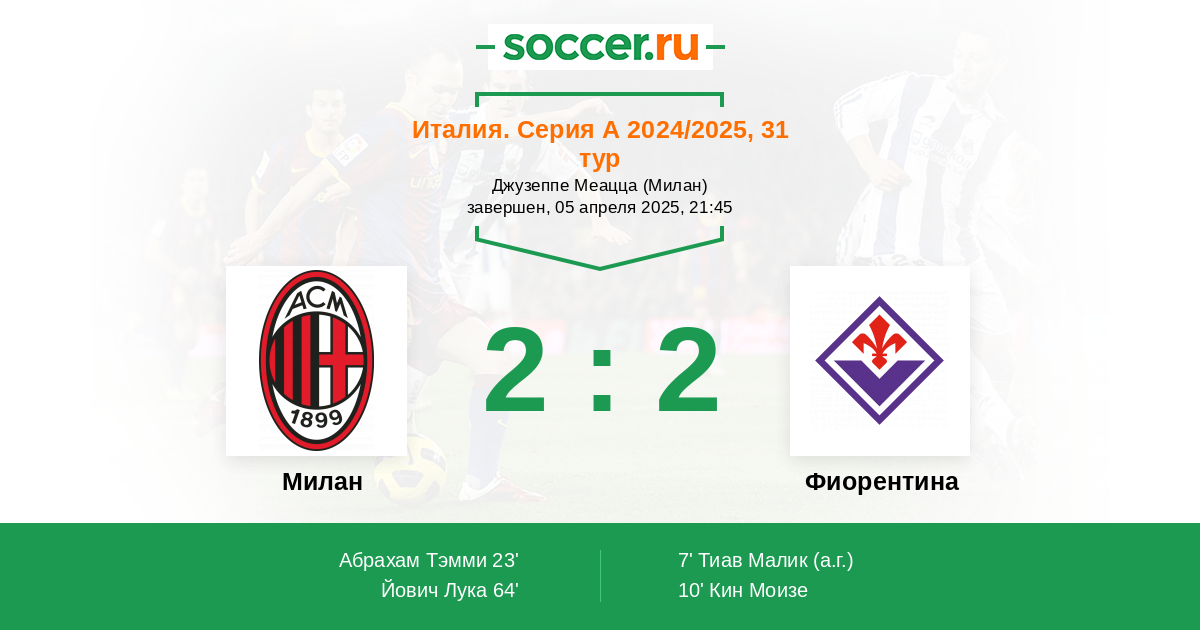 Милан - Фиорентина ! Встречаются соседи по тур . таблице . Которые ещё не потеряли шансы что бы попасть в ЕК . Жду от команд атакующий игры и естественно голы .