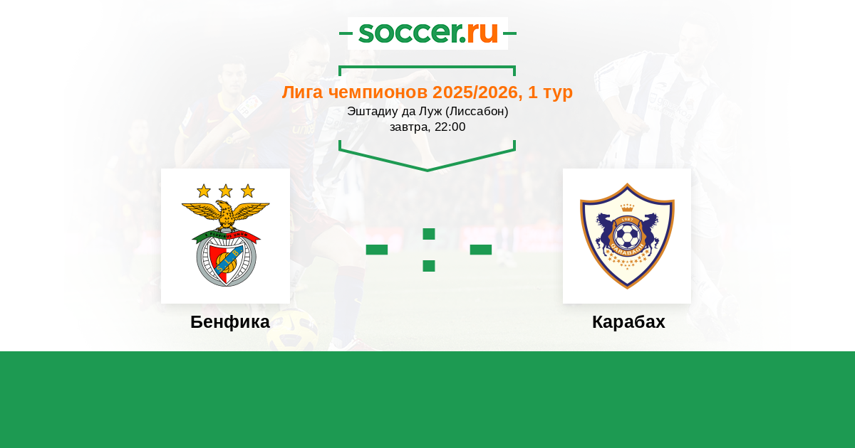 В предстоящем матче 1 - го тура общего этапа Лиги Чемпионов УЕФА между командами Бенфика Лиссабон Португалия и Карабах Азербайджан , более чем явным фаворитом на победу является команда хозяев Бенфика