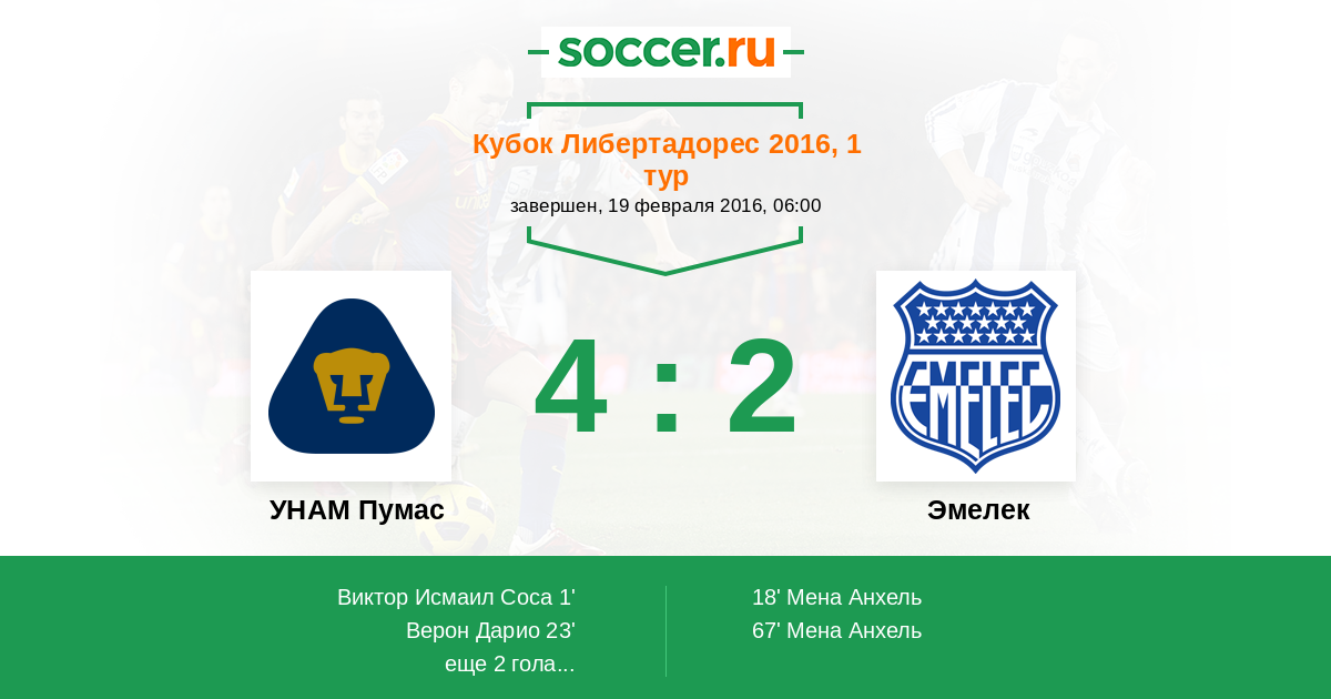 18' (1:1) Мена Анхель (13) (Эррера Эммануэль (20))