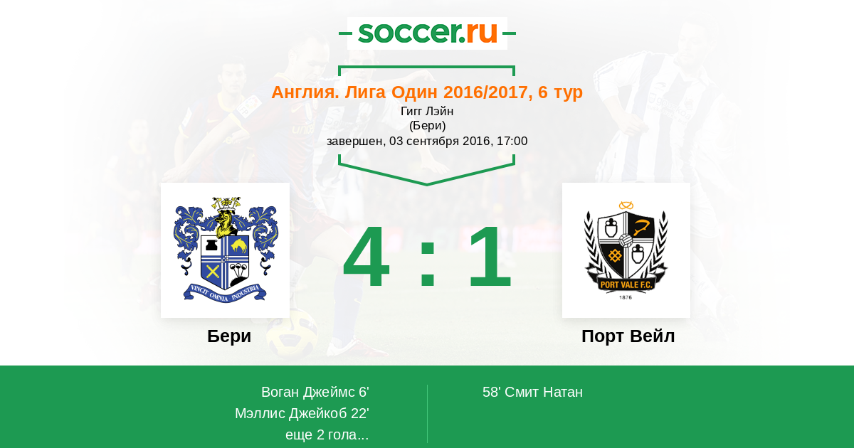 6' (1:0) Воган Джеймс (12) (Том Поуп (11))