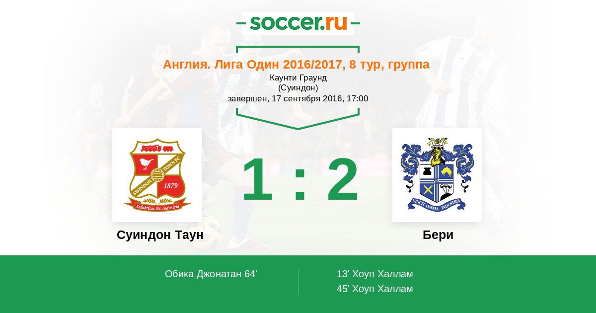 64' (1:2) Обика Джонатан (9) (Мюррей Шон (22))