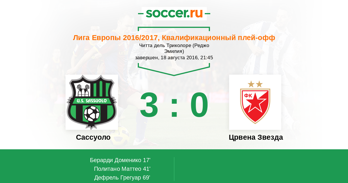 41' (2:0) Политано Маттео (16) (Берарди Доменико (25))