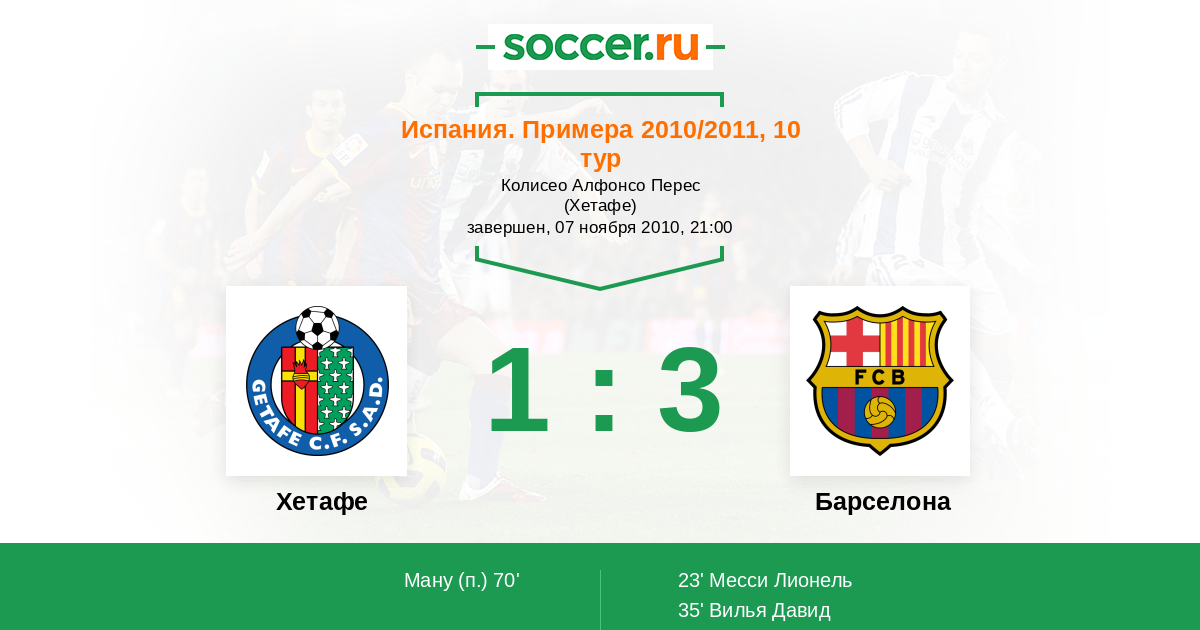 23' (0:1) Месси Лионель (10) (Вилья Давид (7))