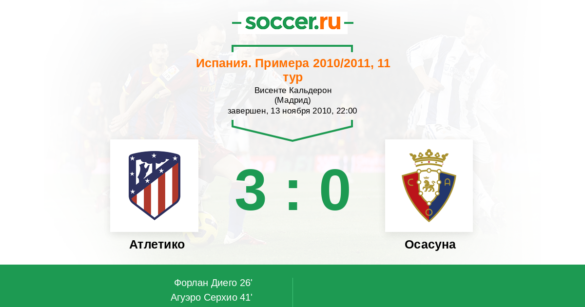 41' (2:0) Агуэро Серхио (10) (Форлан Диего (7))