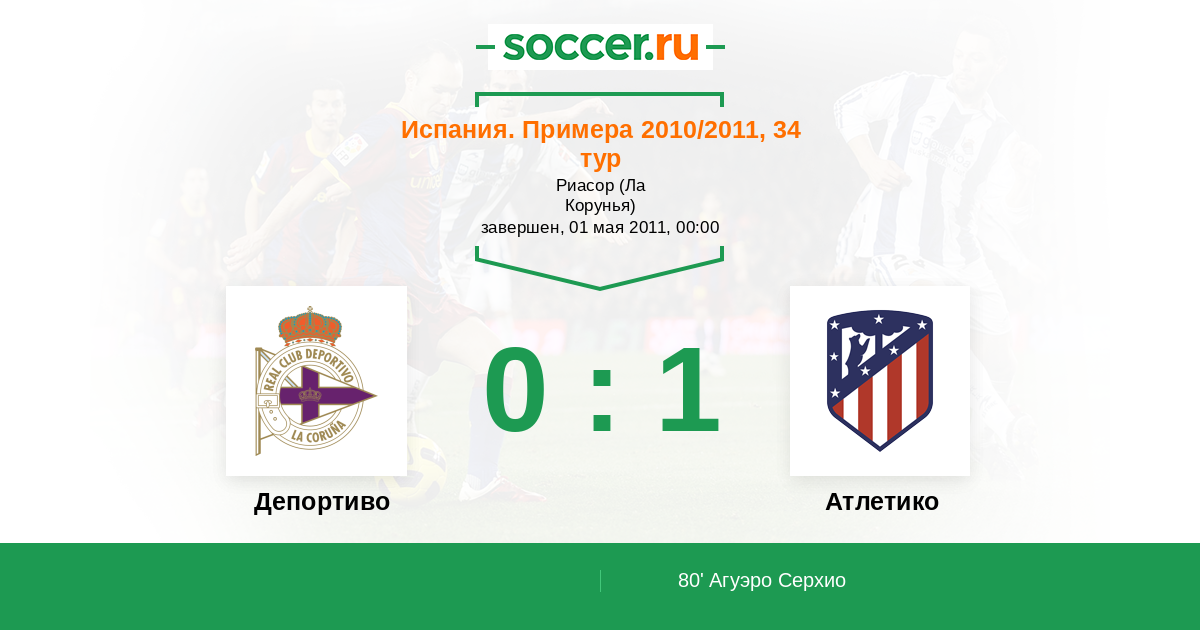 80' (0:1) Агуэро Серхио (10) (Хуанфран (20))