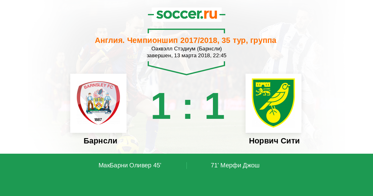 45' (1:0) МакБарни Оливер (15) (Йадом Энди (17))