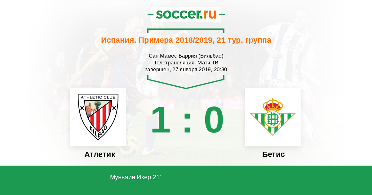 Отлично сыграл Атлетик выложились пополной! Муньаин техничный гол забил, карсиво сыграл в Апл бегунки даже не смогли бы обработать этот мяч а не то что по воротам попасть. Бетис слабо сыграл только в конце когда удаленее немного напряг басков. Фанаты молодцы хорошо подерживали пели и вообще их много пришло. С победой Атлетик Бильбао!