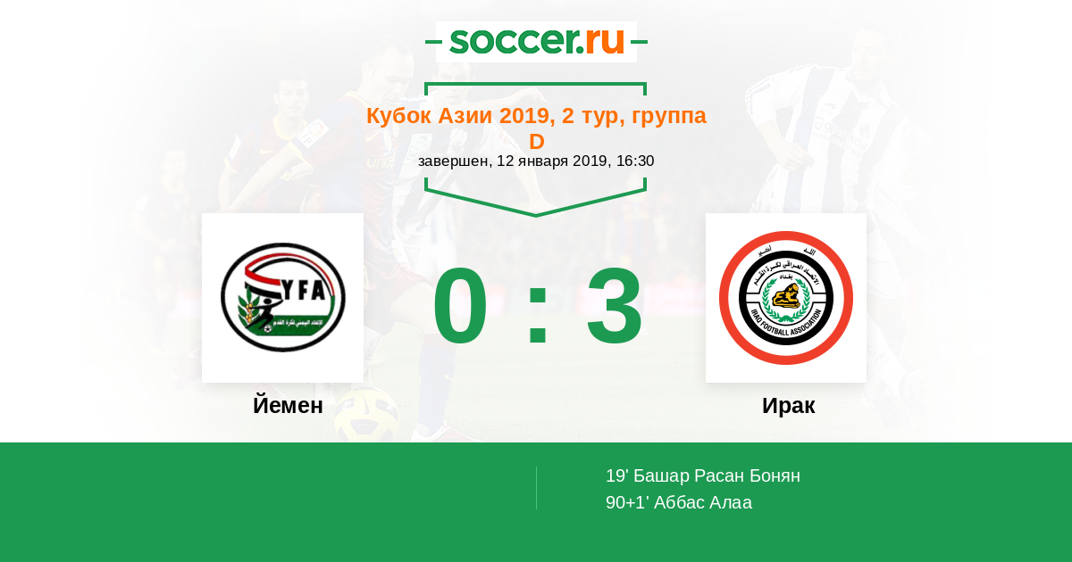 19' (0:1) Башар Расан Бонян (13) (Аднан Али (6))
