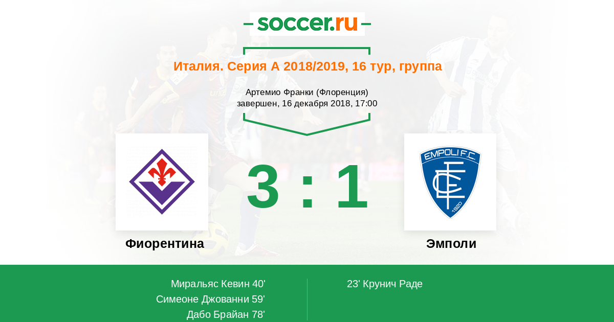 40' (1:1) Миральяс Кевин (11) (Симеоне Джованни (9))