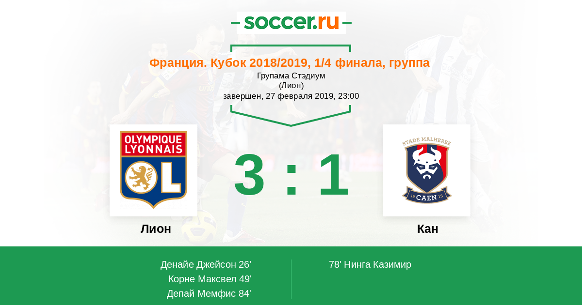 26' (1:0) Денайе Джейсон (5) (Депай Мемфис (11))