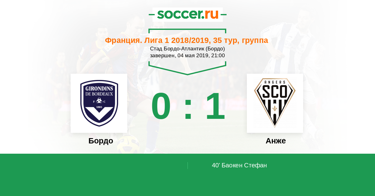 40' (0:1) Баокен Стефан (19) (Тэ Флавьен (20))
