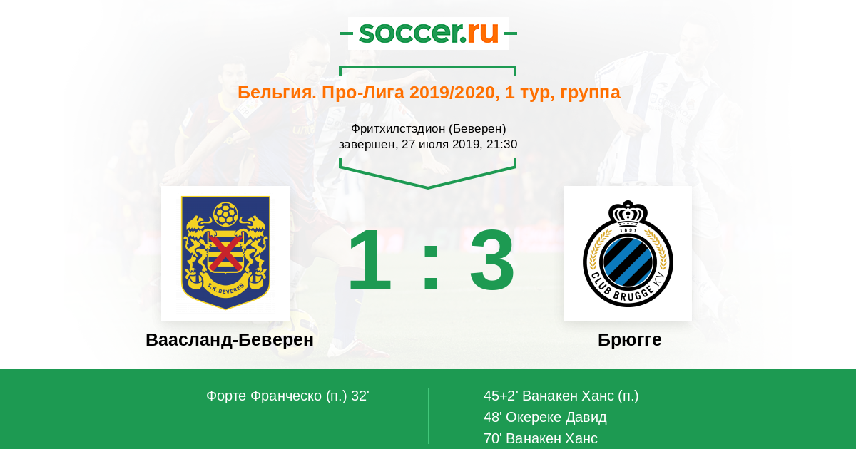 70' (1:3) Ванакен Ханс (20) (Вормер Рууд (25))