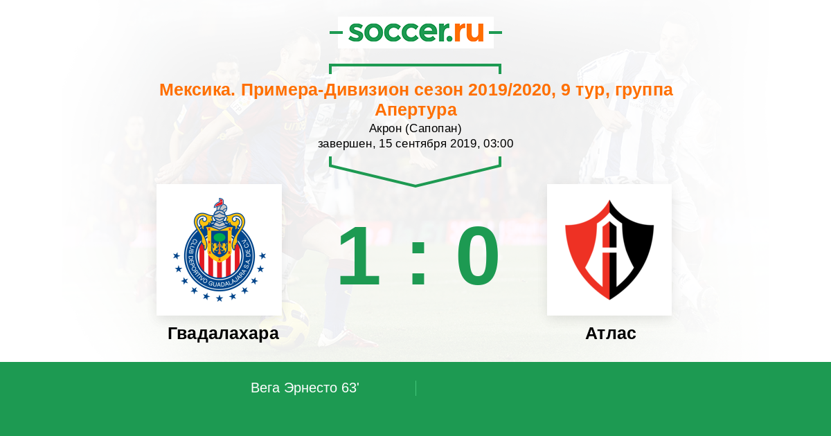 63' (1:0) Вега Эрнесто (7) (Сервантес Алан (31))