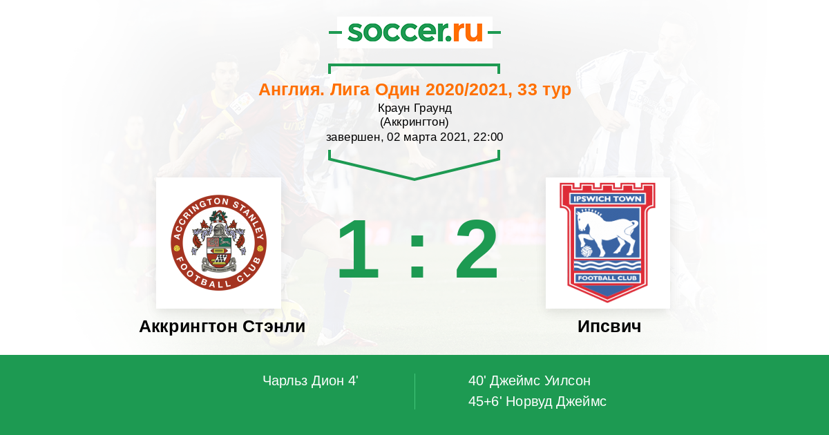 45+6' (1:2) Норвуд Джеймс (10) (Доззелл Андре (23))