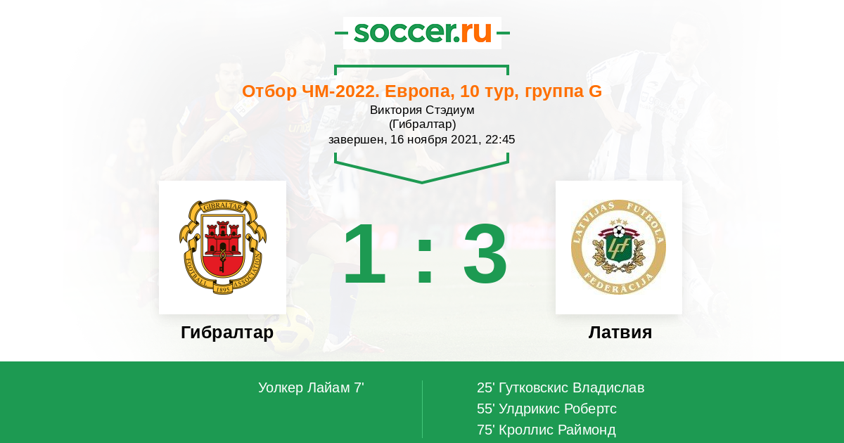 Именно сборная Латвии - худшая после Гибралтара команда в группе G. И только в матче против этого соперника в этом отборе к ЧМ-2022 островитяне проиграли с разницей менее чем в три мяча (1:3). В домашнем матче с таким соперником Гибралтар постарается забить свой четвёртый мяч в этом отборе и первый - домашний.