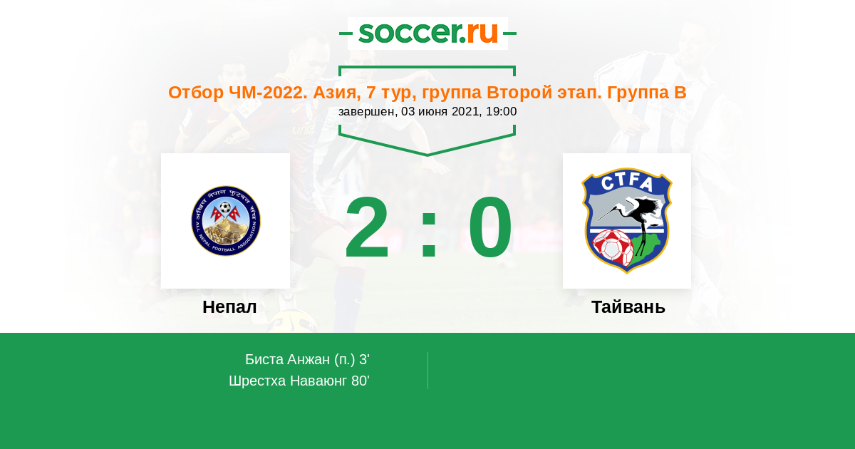 Непал- Китайский Тайпей . моё мнение: будет как минимум 3 гола . а то и больше